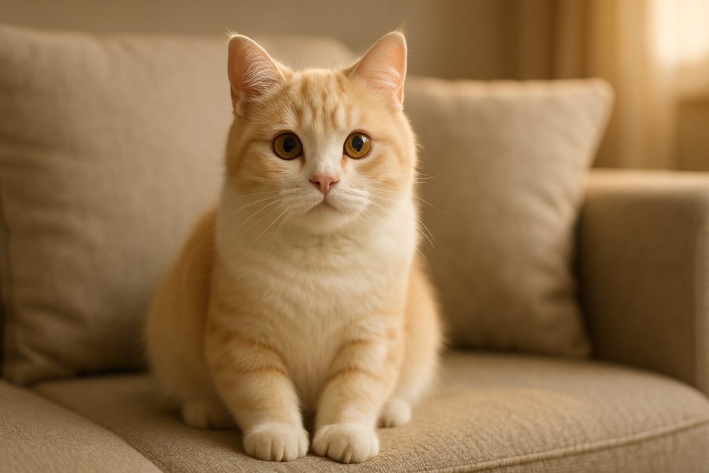 a cute cat sitting on a sofa, soft lighting, 8K, photorealistic