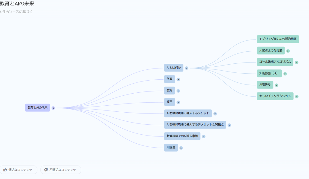 Mind Mapは、AIが情報のつながりを図にして整理してくれる機能です。クリックするだけでトピックを深掘りできるので、複雑なテーマもパッと見て理解しやすくなるのがポイントです。