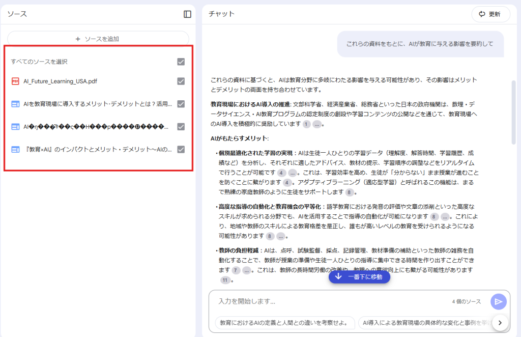 1. 教育に関するウェブ記事を3つ、PDF資料を1つ選んでNotebookLMにアップロード。