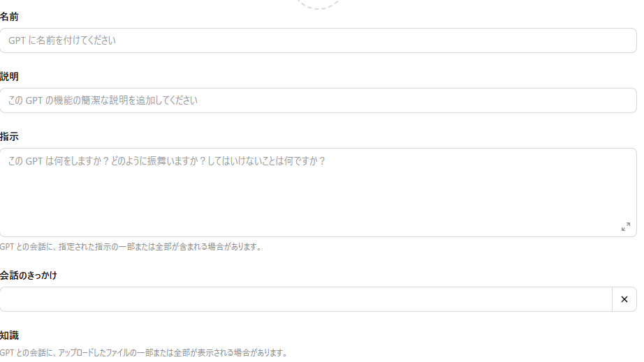 「このGPTはどういうふうに話して、どんなサポートをするか?」という「指示(Instructions)」を書きます。