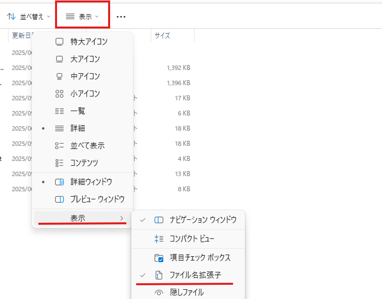 - Windowsの場合:エクスプローラー → 表示 → 「ファイル名拡張子」にチェックを入れてください。